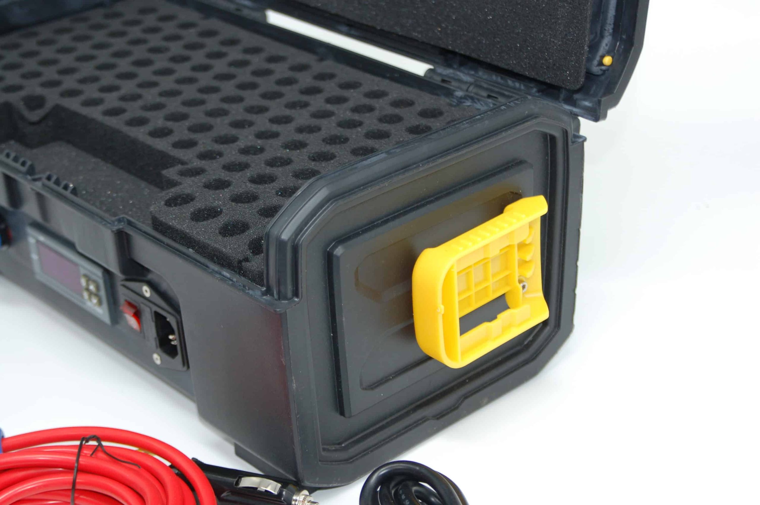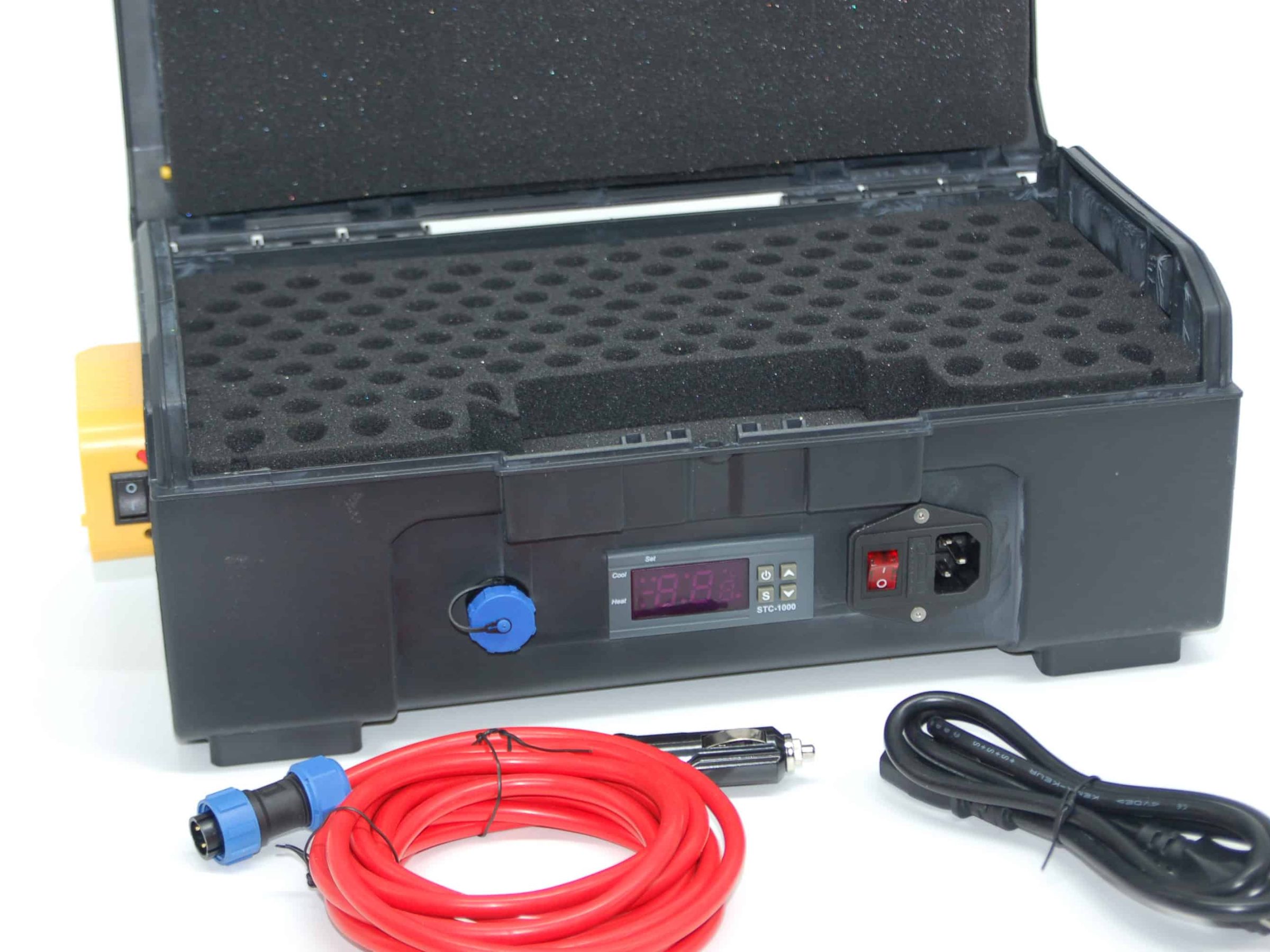 At Apis Engineering we’ve been working hard on our latest offerings. Shown below are pics of our latest “tri-power” queen cell caddy’s. These units come in two sizes, 130 cell and 200 cell. They have three power supply options: 1. Either Dewalt or Milwaukee battery power, 2. Use the 12V power adapter from your vehicle or 3, 110VAC residential power. No longer will you be restricted to only one or two power supply choices. The battery power is on the left side of the unit which includes an on/off switch. The right side of the unit is for storage of a spare battery… that’s right! The port on the left front is for connection to a power outlet (cords included) and the right front port is for 110VAC with an on/off switch. If you accidentally have more than one power source connected at the same time, no worries, internal circuitry takes care of it.